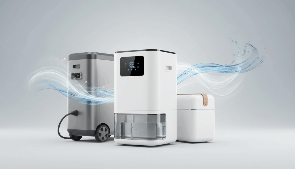 Funktioner inkluderer automatisk fugtstyring, driftprogrammer Auto/Standard, vandtank eller direkte afløb og lavt støjniveau. Mange modeller er energivenlige og lette at flytte takket være håndtag eller hjul.