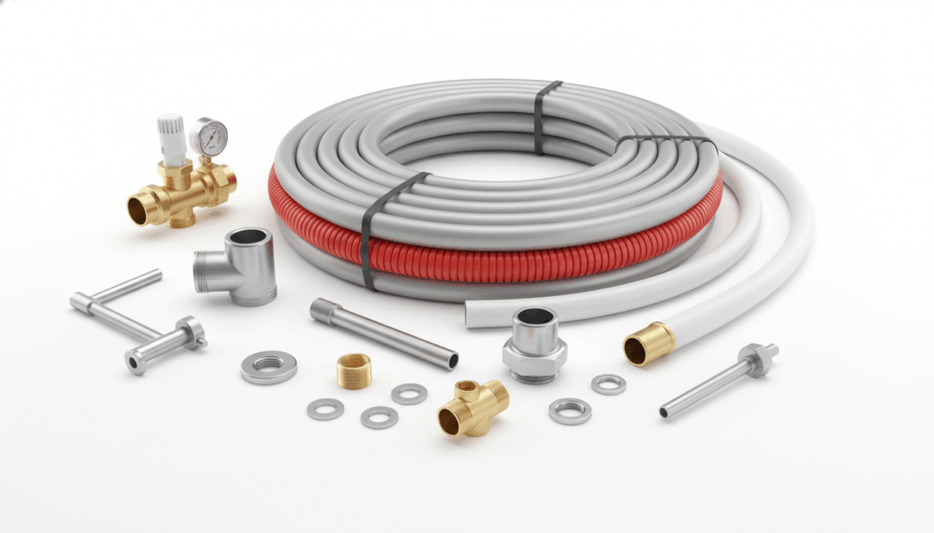 Rør-løsningerne fås som standard alupex-rør og som RIR-rør, der giver plads til isolering og bedre varmeudnyttelse. Materialerne har iltbarriere og VA-godkendelse og tåler omkring 70°C kontinuerligt og 95°C kortvarigt ved 10 bar. Længderne varierer fra 5 m til 50 m-ruller.