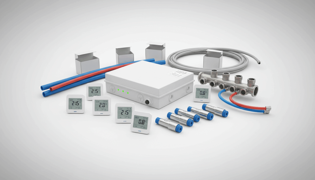 Gulvvarmepakker er komplette systemer til gulvvarme, der samler styring, sensorer og fordelingskomponenter i én pakke. Kategorien inkluderer trådløse pakker til 2, 4, 5, 6 og 11 kredse — med master modtagerboks, telestater og trådløse rumfølere med display. Nogle modeller leveres med fordelerrør, andre ikke, så tjek indholdet ved køb. Pakkerne giver præcis temperaturkontrol i hvert rum, behagelig varme og energieffektiv styring i hele boligen. Overvej antal kredse, om styringen er trådløs eller kabelbundet samt inkluderede sensorer. For bredt udvalg se VVS.dk og WATTOO.DK.