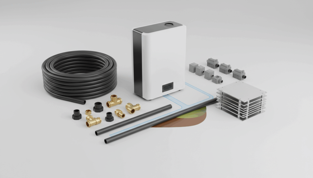 Jordvarme / væske-til-vand omfatter systemer og tilbehør, der udnytter jordens varme via en væske-til-vand varmepumpe og lukkede jordsløjfer. Kategorien indeholder komplette anlæg til boligopvarmning og varmt vand samt tilbehør som jordvarmerør, fittings, pladesæt og installationskomponenter. Produkterne spænder fra rør i PE80-rr (typisk 40 mm) og lange sløjfer til støttende udstyr, der giver lavt tryktab og høj driftssikkerhed. Ved valg af løsning vurderes kapacitet i kW, sløjfetype og rørdimensioner, samt installationens krav. Læs mere hos DBVVS og WATTOO.DK.