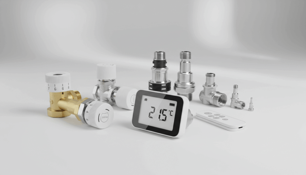 Typiske produkter inkluderer TRV-ventiler, RA/RAX/RAV-typer, termostatindsatser og tilbehør som afspærringsventiler og reguleringsmoduler. Der findes både mekaniske hoveder og digitale enheder, og finish varierer for at passe ind i moderne indretning. Ved køb bør du tjekke tilslutningsstørrelse (oftest 1/2 og 3/4 tomme) og temperaturinterval samt om du vil have manuel eller fjernbetjent styring. Se eksempler fra WATTOO.DK og Billigelogvvs.dk.
