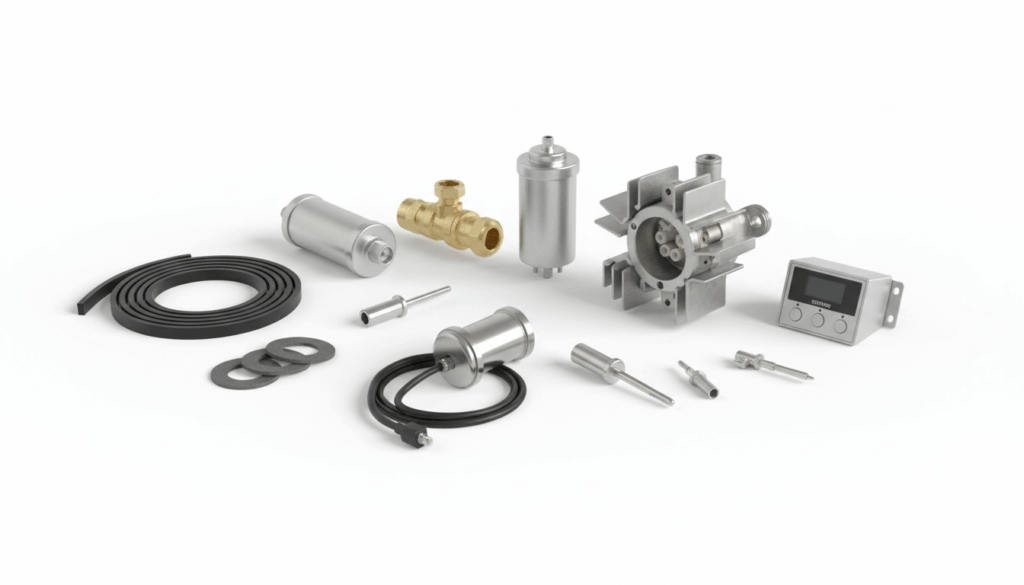 Kedelfølere måler vandtemperatur og styrer pumpen, mens tætningslister forhindrer utætheder og luftlækager. Brænderdeler og sensorer sikrer forbrænding og effektiv varme, og elektroniske styringer giver præcis temperaturregulering og sikkerhed.