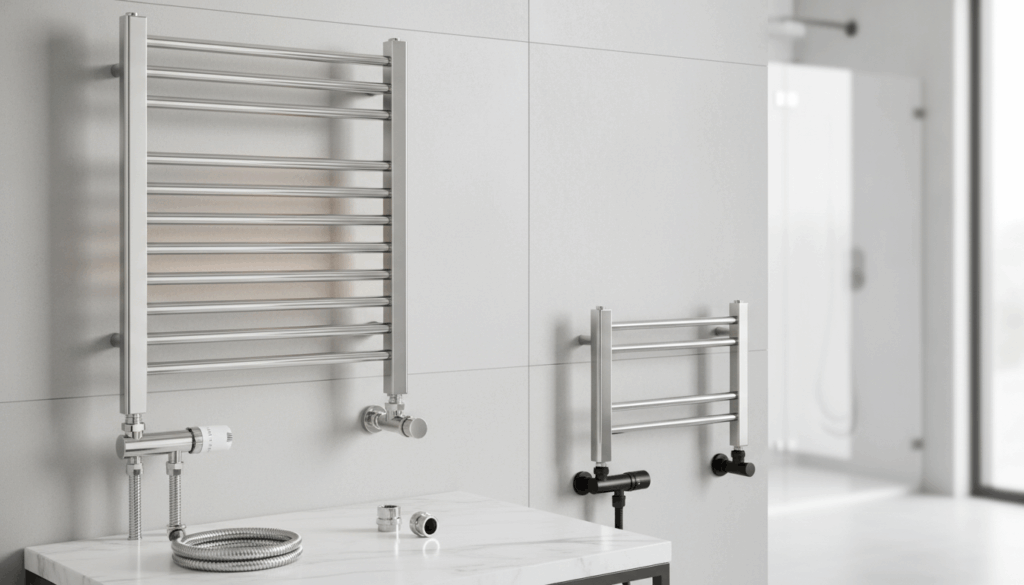 Når du vælger, bør du overveje tilslutningstype (venstre- eller højremonteret termostat), ønsket temperaturkontrol og den tilgængelige plads til montering. Der findes forskellige længder og variationer fra enkelt- til dobbeltrør samt fuldt reguleringsudstyr, der gør installationen nem og præcis. Se udvalgte produkter fra Haandklaedetoerrer og Elvvs i sortimentet.